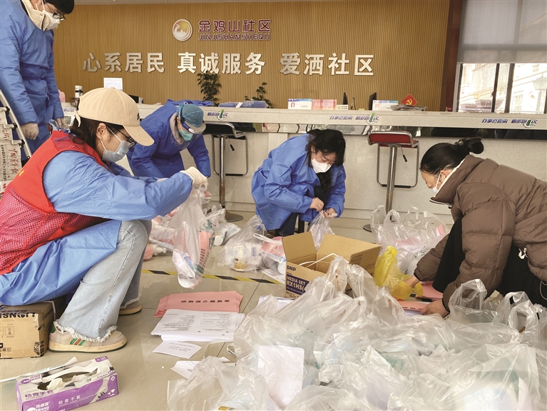 拆箱、分药、装袋,放上说明书、社区联系卡,再给袋子打上结……社区办公室俨然成了“小作坊”,13位身着防护服或志愿服、戴着手套的人,有的站着,有的蹲着,在各自岗位有条不紊地做着“流水线”。