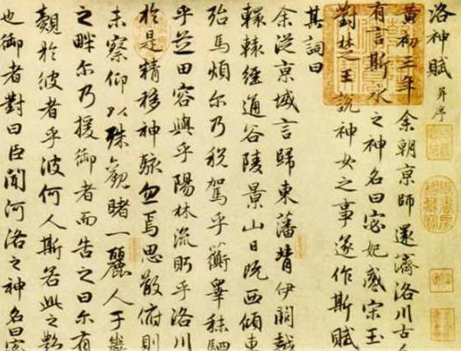 此事可从元代文人黄溍的《题吴兴赵公书洛神赋》中找到印证:“此赵公被敕书宝陀寺碑时所写。公是行遇暴风昌国巨海中,舟垂覆而免,殊不以为意,方且游戏翰墨,及乎‘屏翳收风,川后静波'之句,岂非善谑者哉。即此亦足以观其雅量矣。”面对风浪,赵孟頫依旧在船上作书法,写的还是曹植的《洛神赋》,“屏翳收风,川后静波”中水波不扬的宁静画面与东海上的大风大浪形成强烈对比。也正是这短短几句,赵孟頫作为书画大家泰山崩于前而色不改的气度也呈现在大家的眼前。