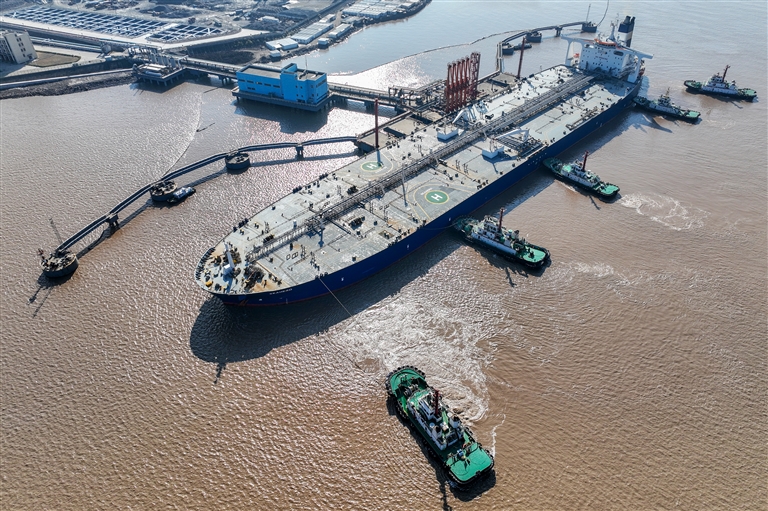 昨天上午10时半,三十万吨级巴拿马籍油船“海英”轮缓缓靠泊外钓岛油品码头,开始卸载27.59万吨原油。这些原油将输送至鱼山绿色石化基地。
