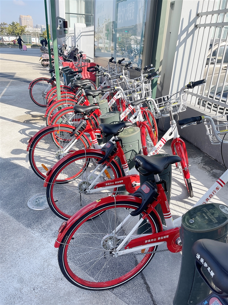 本报讯 近日,一批崭新的红色自行车亮相我市街头。这是我市今年新投放的公共自行车,将实现定海、新城、普陀三地“通借通还”。此后,原有的定海“小绿车”、普陀“小蓝车”等公共自行车将逐步被这种“小红车”取代。