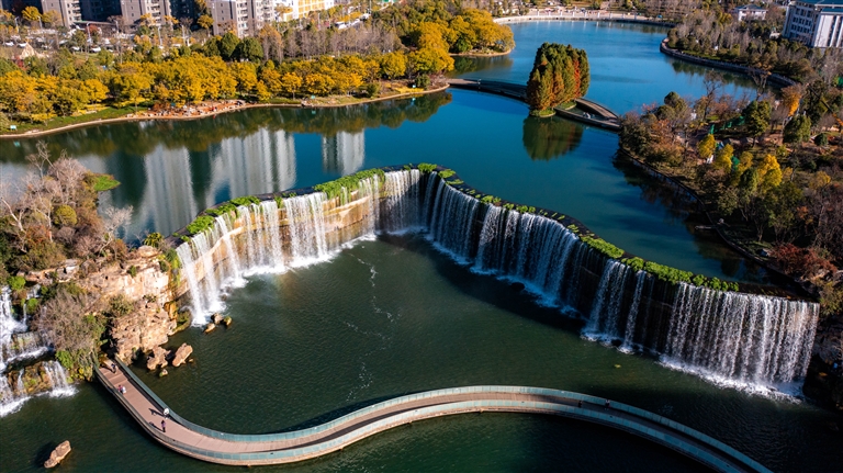 1月4日拍摄的昆明市瀑布公园一景(无人机照片)。