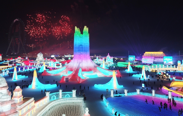 当日,第39届中国·哈尔滨国际冰雪节开幕式在哈尔滨冰雪大世界园区举行。本届哈尔滨国际冰雪节以“冰雪六十年,共赴新征程”为主题。期间,哈尔滨市将推出多项冰雪活动,彰显冰雪文化之都的独特冰雪魅力与活力。 新华社记者 王建威 摄