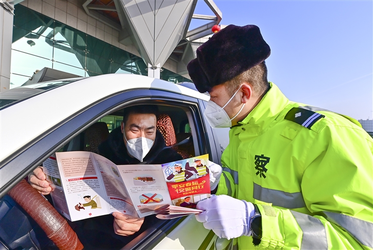 1月7日,乌鲁木齐市公安局交警支队民警在乌鲁木齐地窝堡国际机场向接送机驾乘人员开展春运交通安全宣传 新华社记者 王菲 摄