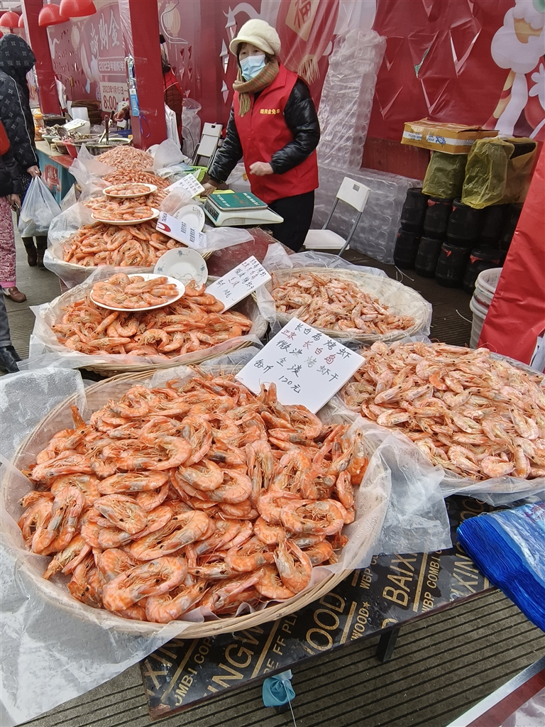 黄澄澄的大黄鱼、红彤彤的虾干在摊位前堆成了小山;手工灌制的土家香肠散发着阵阵鲜香,青翠欲滴的蔬果上还带着晶莹的露珠……昨天,“嗨购金兔年”2023年普陀年货供应会正式开市,市民们在做好个人防护的同时,纷纷走出家门采买年货,为冬日里的舟山带来一拨又一拨的暖意。