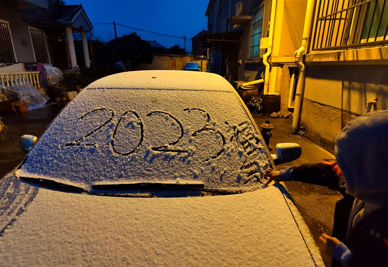 昨天,我市迎来2023年的第一场雪。夜间,定海白泉部分地区出现积雪。薄薄的一层雪像是为汽车披上了一件白色外套。