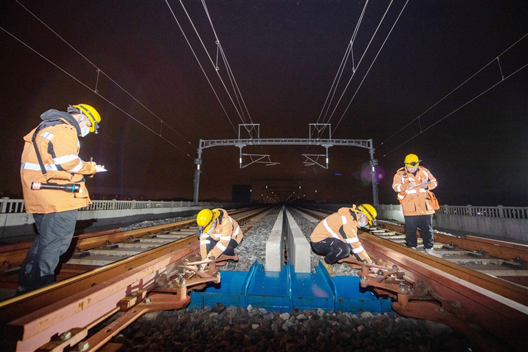 近日,浙江省迎来降温天气。铁路宁波工务段椒江桥隧工区的工人们利用夜间高铁线路的“天窗期”,顶着冬夜的寒风对杭台高铁椒江特大桥进行全方位检查,确保线路安全。 新华社记者 江汉 摄