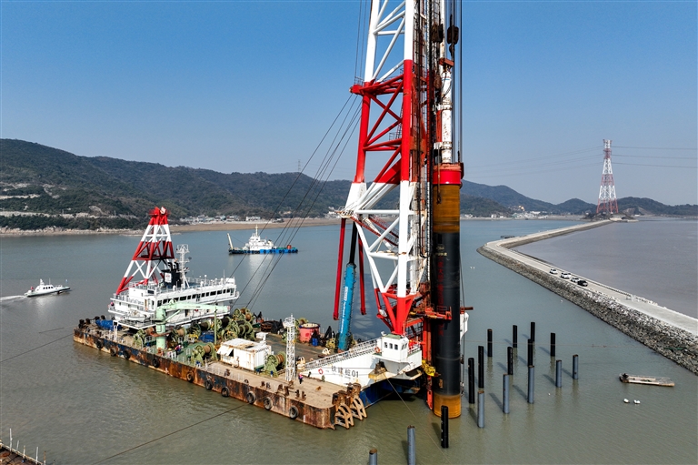 昨天,一根直径3.5米、长34.8米、重93.9吨的永久钢护筒顺利打入宁波舟山港六横公路大桥二期工程双屿门大桥佛渡侧主墩水域位置,由此拉开了主墩桩基施工的序幕。六横公路大桥二期工程包含双屿门特大桥和青龙门特大桥2座世界级跨海桥梁。其中,双屿门特大桥连接六横岛与佛渡岛,跨度1768米,是国内最大跨度跨海桥梁,同时也是世界最大跨度单跨吊钢箱梁悬索桥。