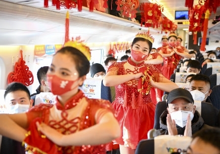 临近春节,中国铁路兰州局集团有限公司银川客运段将部分列车车厢装扮一新,组织青年职工在列车上表演自编的节目,为旅客送上小礼物,让人们将旅途中的欢乐带回家。