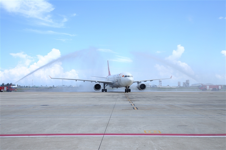 1月18日,中国首都航空JD455航班在马尔代夫马累维拉纳国际机场接受水门礼。 新华社记者 车宏亮 摄
