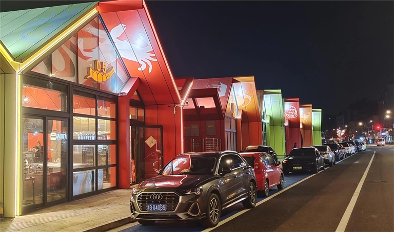 经过全新改造后,重回滨港路试营业的沈家门夜排档,成为行业里一道独特的风景。一排排车辆停靠得整齐有序,多为宁波杭州等外地牌照。黄色红色橙色的钢结构小屋一字排开,在寒风中看起来格外暖心。装饰着各种卡通式海洋生物的屋顶和墙面,让人对驰名已久的舟山海鲜心向往之。