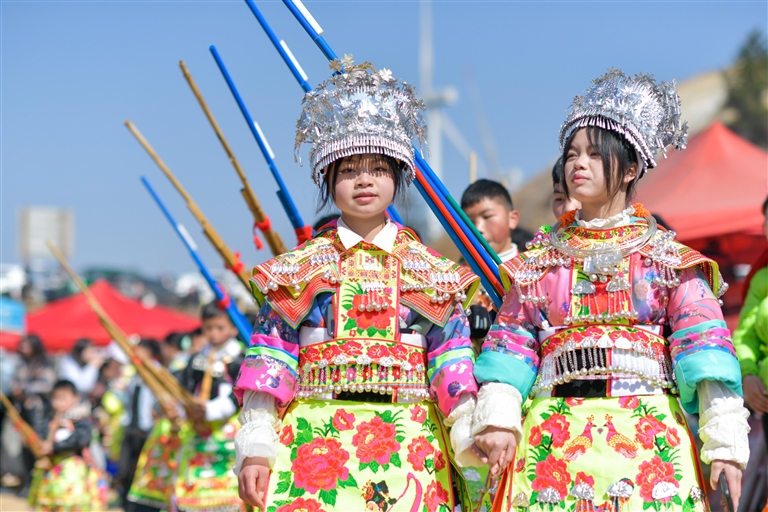 当日是大年初八,在贵州省黔南布依族苗族自治州龙里县龙山镇中排村,各村寨的苗族群众欢聚一堂,举行一年一度的“跳月”活动,欢庆新春。“跳月”是当地苗族群众祈福风调雨顺、欢庆新春的传统民俗活动,也是苗族青年男女寻找意中人的大型社交活动。