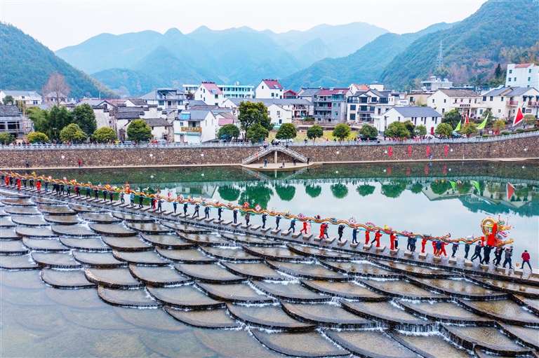 2月1日,窈口村女子板龙队在湖源乡的龙鳞坝碇步桥上进行舞龙表演(无人机照片)。