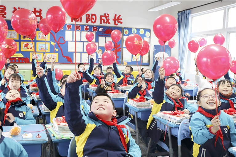 2月6日,浙江省杭州市桐庐县学府小学,学生在展示红色气球。