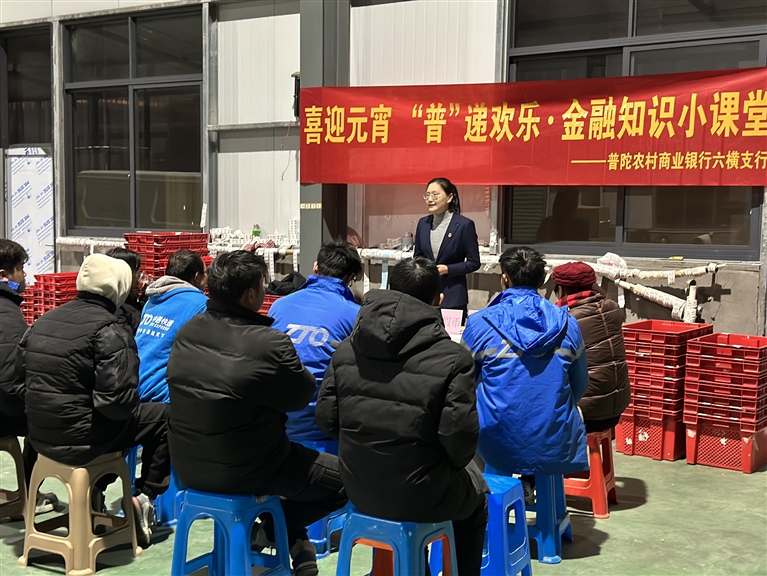 在元宵佳节前,普陀农商银行六横支行员工来到鑫通物流公司开展“喜迎元宵,‘普’递欢乐”金融知识宣讲活动,向“最熟悉的陌生人”送上节日祝福。