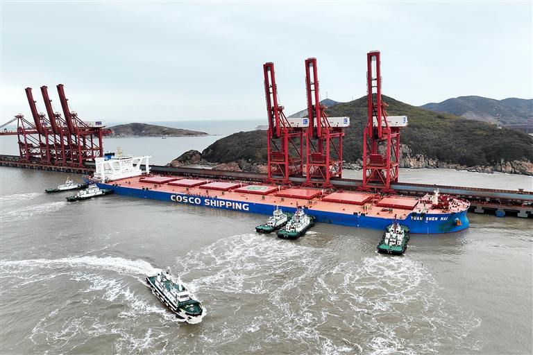 近日,“远神海”矿砂船靠泊鼠浪湖矿石中转码头,这是该码头新春第二艘到港作业的40万吨级矿砂船 摄影 通讯员 姚峰 张旭东