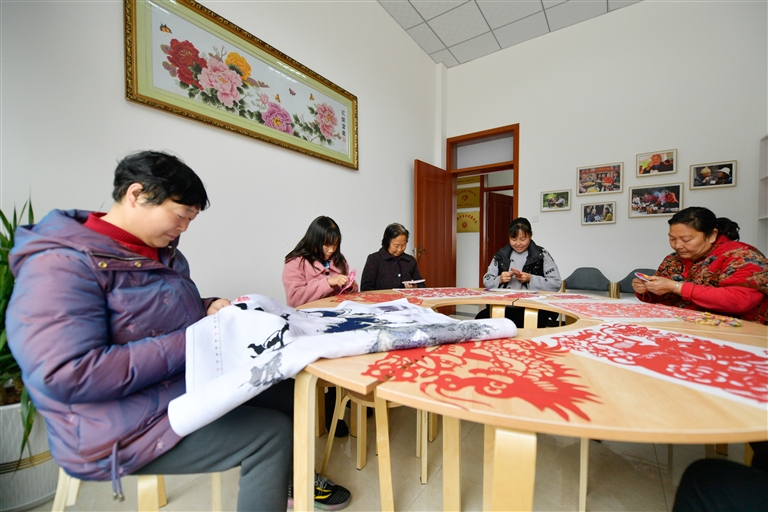 在陇南市徽县虞关乡许坝村“幸福家园”,妇女们在一起做手工(2月11日摄)。