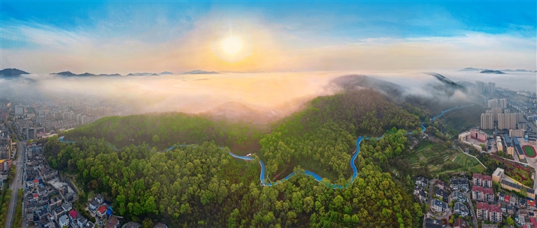 漫步东海云廊竹山段,绿道沿线树木茂密,鲜花绽放,红色元素与山海景观相融交织。去年,这条线路入选省级最美绿道,竹山“不能不走的英雄路”全年吸引市民游客超165万人次。