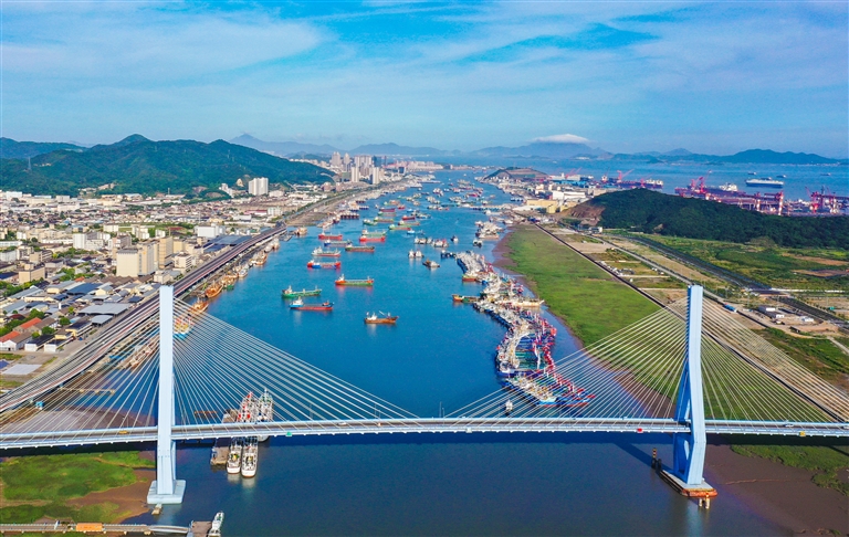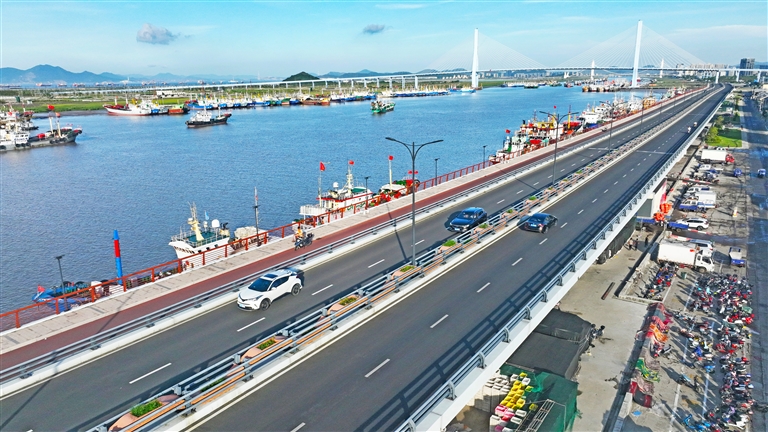 在海面,长虹卧波般的舟岱大桥给岱山发展插上了腾飞的翅膀。六横公路大桥、甬舟铁路、金鹏大桥……一条条跨海通道即将打通,舟楫往来的舟山,将通过一条条跨海通道,更好地带动海岛特色产业发展,融入长三角“大家庭”。