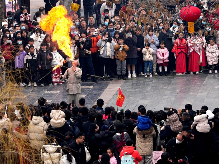 2月18日,游客在开封清明上河园景区内观看民俗表演。