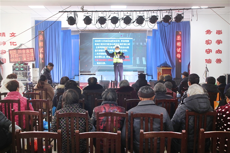 2月20日中午,普陀区交警大队六横中队民警来到六横镇积峙村文化礼堂,走上戏台,利用越剧演出开场前的时间,对村民观众开展交通安全宣传教育。
