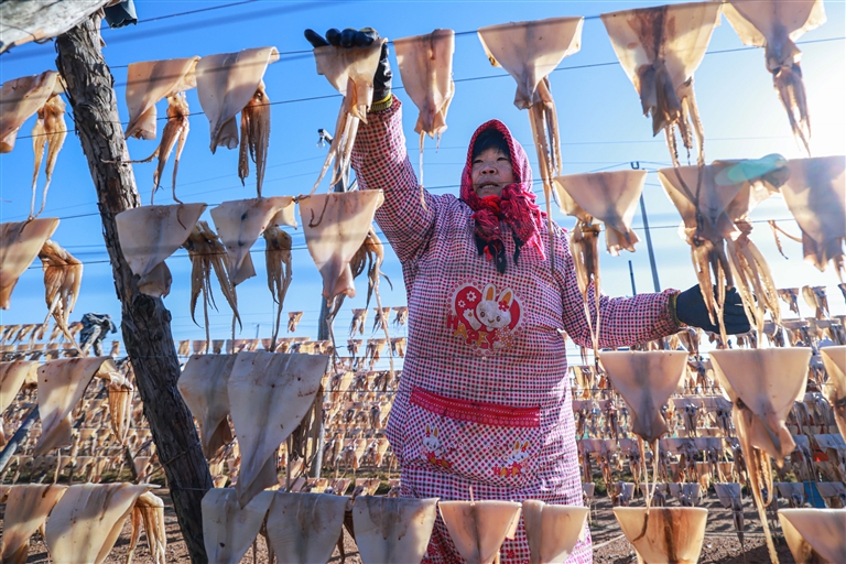 2月20日,在荣成市靖海湾畔一处晾晒场,渔民在晾晒鱿鱼。近日,山东省荣成市靖海湾畔的渔民利用晴好天气,在晾晒场抓紧晾晒鱿鱼,铺展开一幅春日“晒鲜图”。近年来,当地渔民通过电商平台将鱿鱼干制品销往各地市场。 新华社 发(李信君 摄)