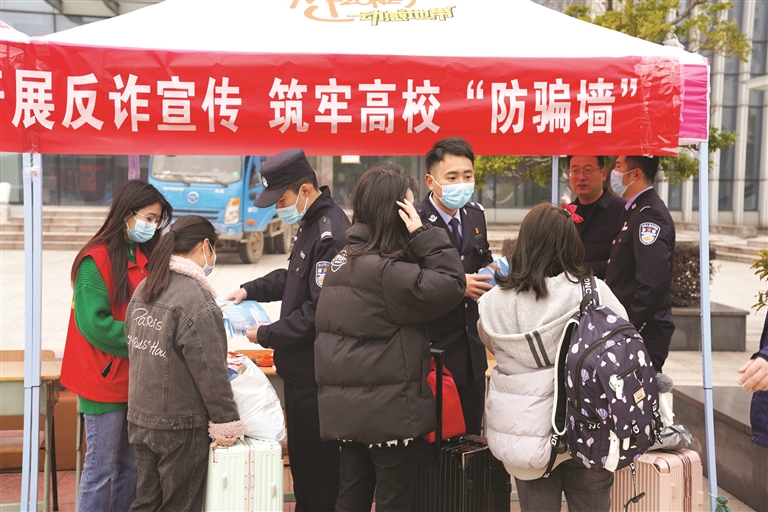 新学期伊始,普陀山公安分局朱家尖派出所联合舟山移动普陀分公司,组织学生志愿者们在浙江舟山群岛新区旅游与健康职业学院摆摊开展集中宣传活动,通过发放反诈宣传手册、现场讲解案例、学习反诈知识送小礼品等方式,增强学生的反诈意识和能力,筑牢高校“防骗墙”。(陈芋洁)