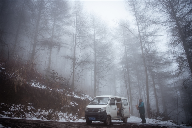 2月23日,由于道路积雪,陈祖章将邮车停在路边,步行上山送件。