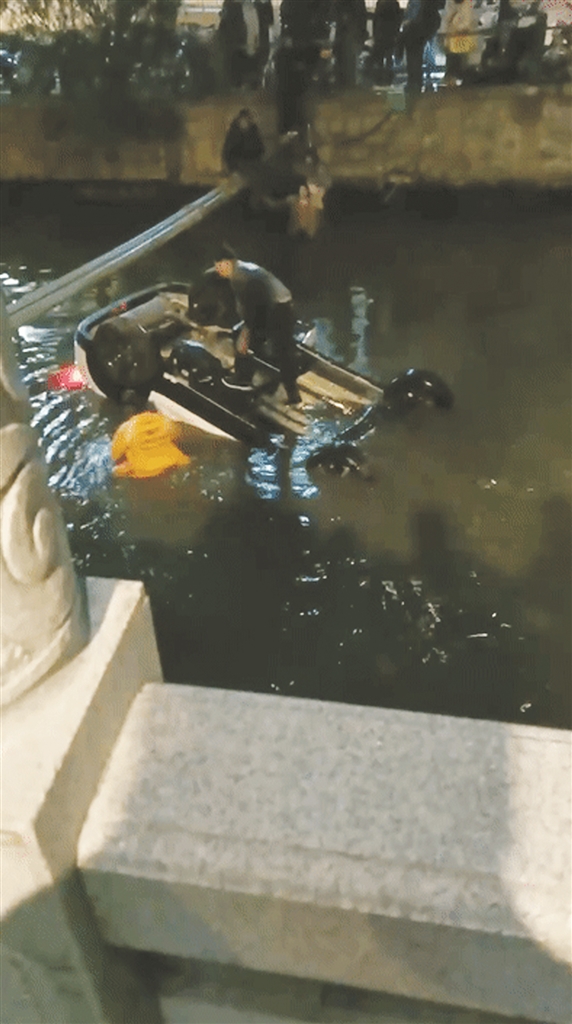 “有车开进河里了!”正在东门附近逛街的谢琦舟看到眼前的景象,发出一声惊呼,他来不及多想,立刻冲到了河边大声呼喊。盛双伟则在对面路口目睹了这一幕,红灯转绿,原本要回家的他,立马把电动车停到路边后就奔向出事地点。
