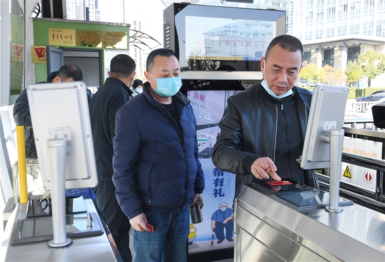 昨天上午,退役军人朱华舟等四人体验免费乘坐市内公交 摄影 记者 沈磊 通讯员 蒋琳