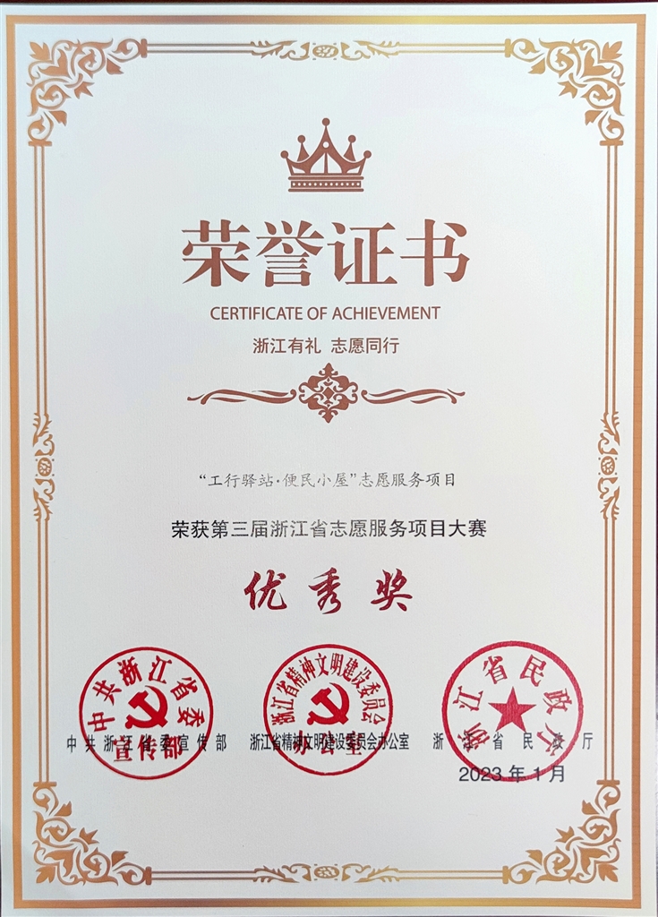 去年,工行舟山分行围绕践行社会责任抓全国文明单位创建,将全市28家营业网点转型升级为包含了军人优抚、普惠金融、乡村振兴、扶贫产品促销、民政救助、爱心捐款(捐物)、志愿者服务等内容的新时代文明实践角“工行驿站·便民小屋”志愿服务平台,以一颗“七彩初心”反哺社会民生,播洒一方绿荫。该项目不仅被评为2022年度舟山市最佳志愿服务项目,还获得由省委宣传部、省精神文明建设委员会、省民政厅颁发的第三届浙江省志愿服务项目大赛优秀奖。