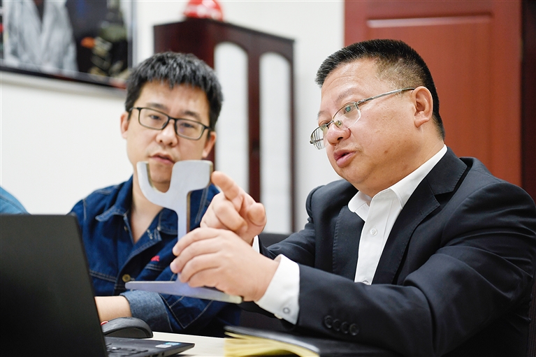 在攀钢集团研究院,邹明(右)与同事一起讨论道岔设计方案(2月21日摄)。