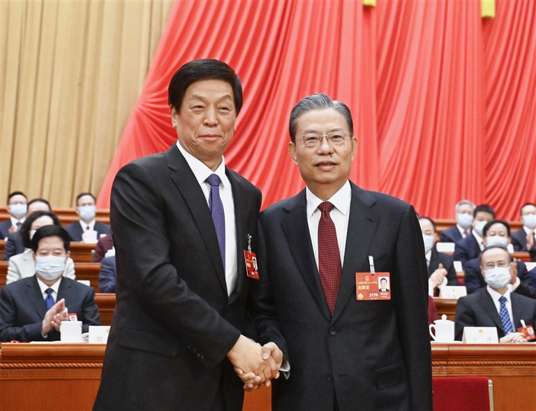 3月10日,十四届全国人大一次会议在北京人民大会堂举行第三次全体会议。赵乐际当选为第十四届全国人民代表大会常务委员会委员长。这是赵乐际同十三届全国人大常委会委员长栗战书握手,相互致意。新华社记者 李学仁 摄