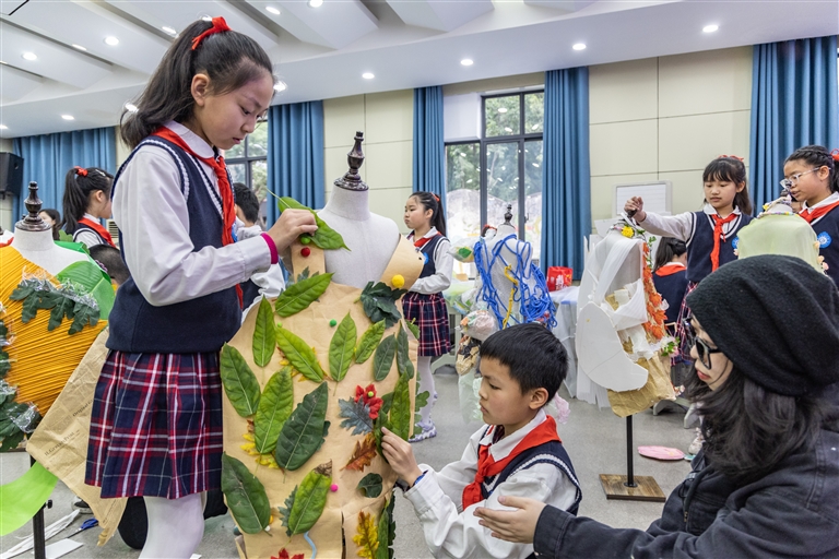 3月10日,重庆市九龙坡区铁路小学的学生们在老师的指导下制作环保服装。当日,为迎接3月12日“植树节”,重庆市九龙坡区铁路小学组织师生举办“我为世界添片绿”植树节环保系列服装设计展示活动。40余名学生在学校老师和美术义工的指导下,收集身边各种可以利用的废弃物,发挥想象力,制作成环保服装,倡导植绿、爱绿、护绿的生态理念和绿色生活方式。新华社记者 黄伟 摄