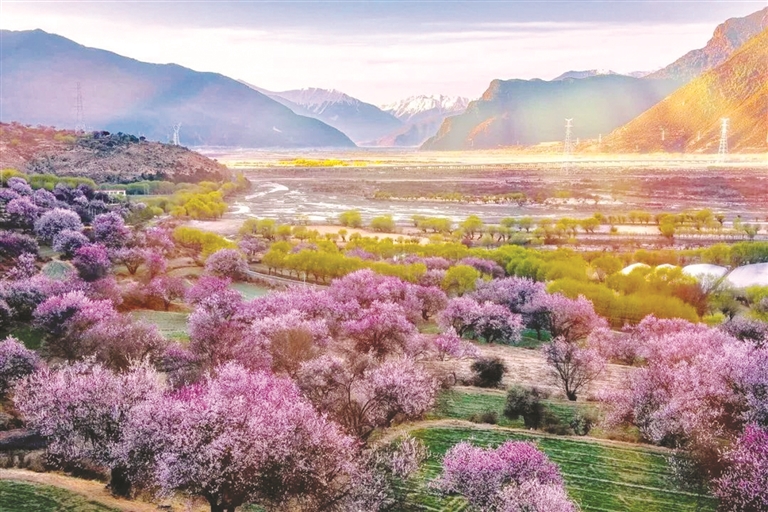 西藏林芝嘎拉村旁,上百亩桃花渐次开放。2021年7月,习近平总书记来到这里看望乡亲们。在总书记的关心下,嘎拉村的乡村振兴路越走越坚实,2022年人均年收入超过3.5万元。