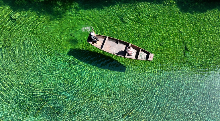 湖北省恩施土家族苗族自治州鹤峰县容美镇屏山村屏山旅游景区河水清澈见底,舟行水上如悬浮空中,美如画卷。 新华社 发(杨顺丕 摄)