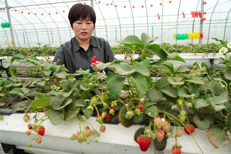 3月16日,在山东省菏泽鲁西新区马岭岗镇,农民正高级农艺师顿俊玲在草莓种植大棚内查看草莓成长情况。
