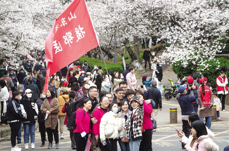 当日,武汉大学举行抗疫医护赏樱专场。珞珈山下,来自全国各地的1.6万余名抗疫医护人员及家属赴约赏樱。 新华社记者 肖艺九 摄