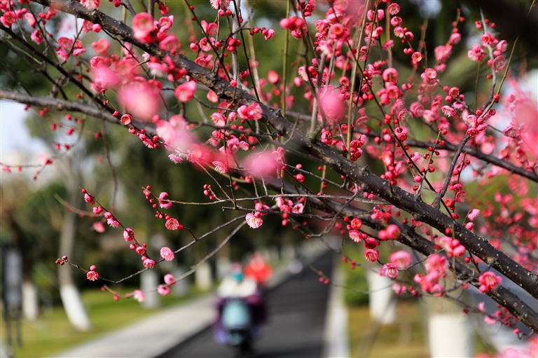 新城港岛路旁,数株红梅迎春绽放,成为一道美丽的风景 摄影 记者 陈永建