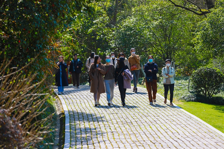 普陀沈院沿线,市民们趁着中午享受春光 摄影 记者 张磊
