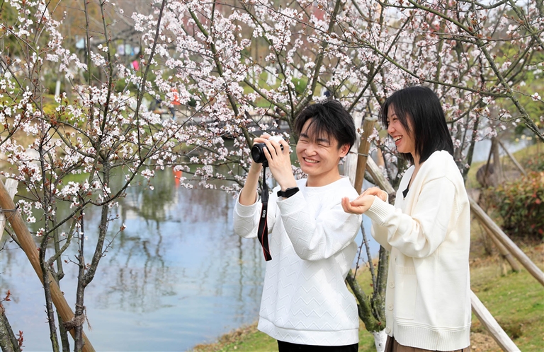 新城樱花公园东园,河岸边的数棵李花树盛放,引来摄影爱好者赏花拍摄摄影 记者 陈永建