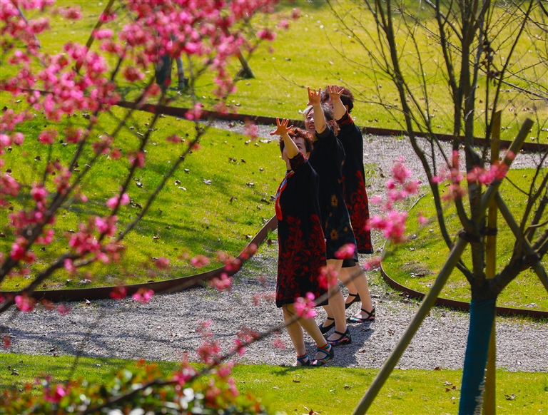 普陀应家湾水库附近,市民们在花丛中情不自禁地跳起了舞 摄影 记者 张磊