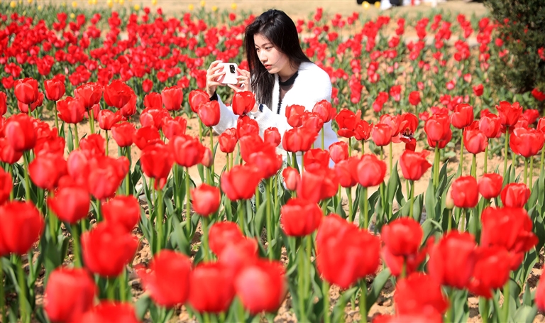 朱家尖大青山郁金香花海美丽绽放。花丛中,一名穿着时尚的女子正在拍照,留住春光里这美好的时刻。摄影 记者 陈永建