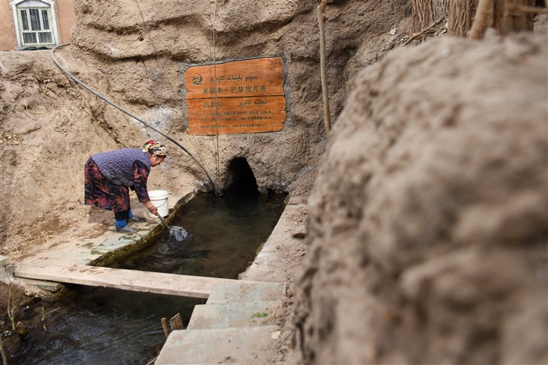 在新疆吐鲁番市高昌区亚尔镇,居民在一处坎儿井出水口取水(3月7日摄)。