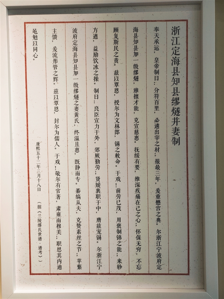 康熙五十四年(1715),缪燧66岁,在那个时代已属高龄,他向朝廷上书,请求致仕。两年前,他再获朝廷制诰嘉奖。这封制诰与34年前一样,颁奖的皇帝还是那位皇帝,受奖的知县仍是那个知县,他们都垂垂老矣,但时代还要继续前行。