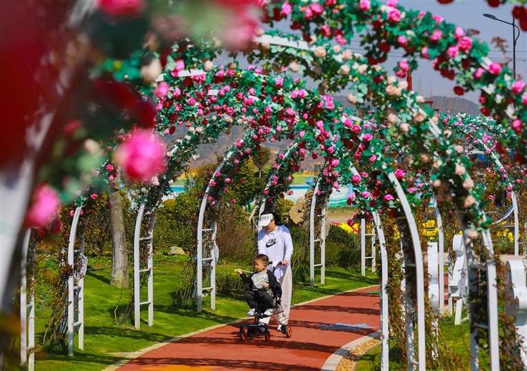 春光里,新城翁浦公园内,几十棵榆叶梅花开艳丽。几名小朋友正在畅快游玩。摄影 记者 陈永建