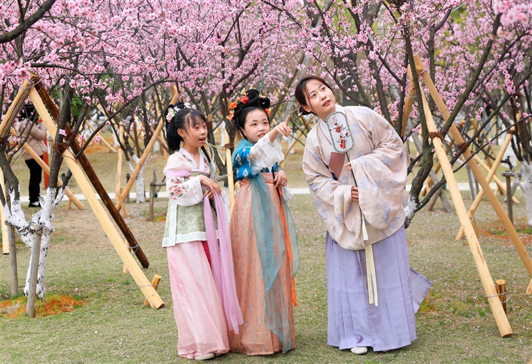 三名汉服爱好者正在新城翁浦公园赏梅合影,记录幸福时刻摄影 记者 陈永建