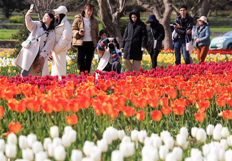 连日来,定海湿地公园的郁金香竞相绽放。市民漫步花海,开启一场春日的盛会。 摄影 记者 姚凯乐