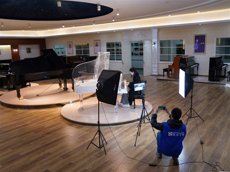 3月23日,德清县洛舍镇东衡村一家钢琴制造企业的工作人员进行直播推介。