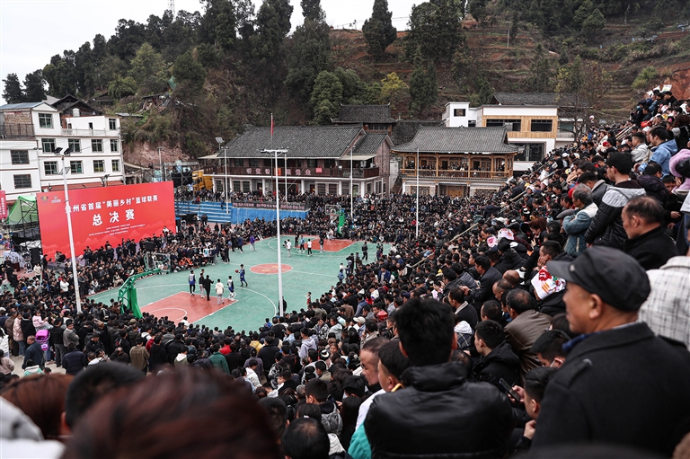 当日,贵州省首届“美丽乡村”篮球联赛总决赛在黔东南州台江县台盘村开打。这项由台盘村“六月六”吃新节篮球赛发展而来的赛事因为火热的现场氛围和“接地气”的办赛风格,在2022年“火爆全网”,被网友亲切地称为“村BA”。 新华社记者 吴壮 摄