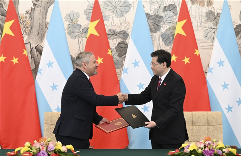 2023年3月26日,国务委员兼外交部长秦刚在北京与洪都拉斯外交部长雷纳举行会谈,并签署了《中华人民共和国和洪都拉斯共和国关于建立外交关系的联合公报》。 新华社记者 张领 摄
